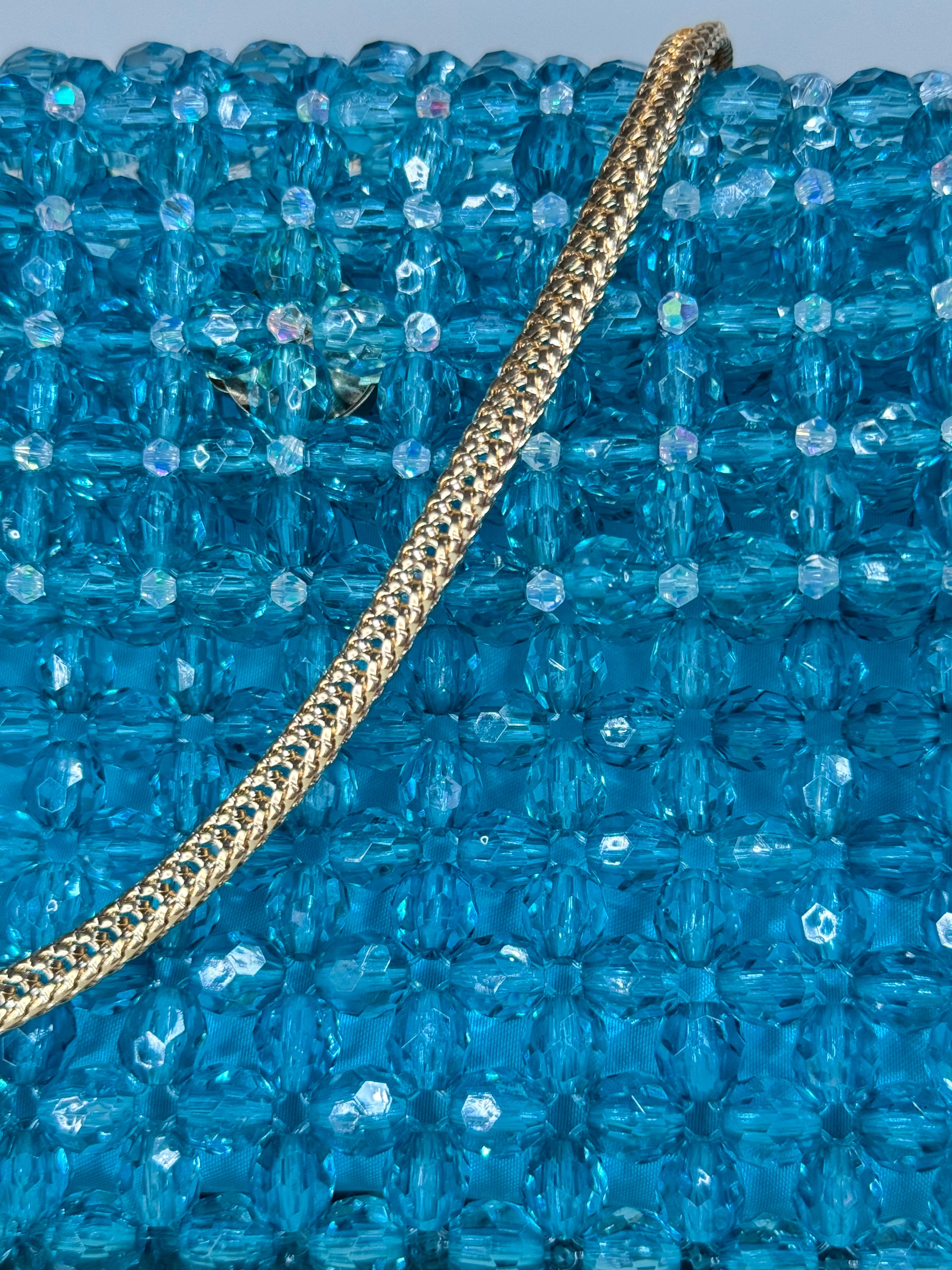 The Azur Blue Bag embodies the clarity and depth of the cosmic sky. Designed in a vivid blue–turquoise tone, this handbag combines upcycled acrylic with carefully hand-applied crystal details, creating a radiant, modern glow.