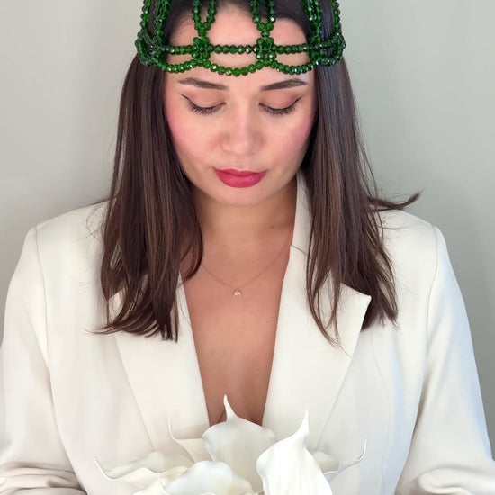 The Gaia Green Headpiece celebrates the spirit of Earth’s goddess; a symbol of balance, nature, and renewal. Crafted with shimmering green crystal beads, each headpiece is hand-beaded in Ireland, offering a touch of celestial grace and timeless craftsmanship.
