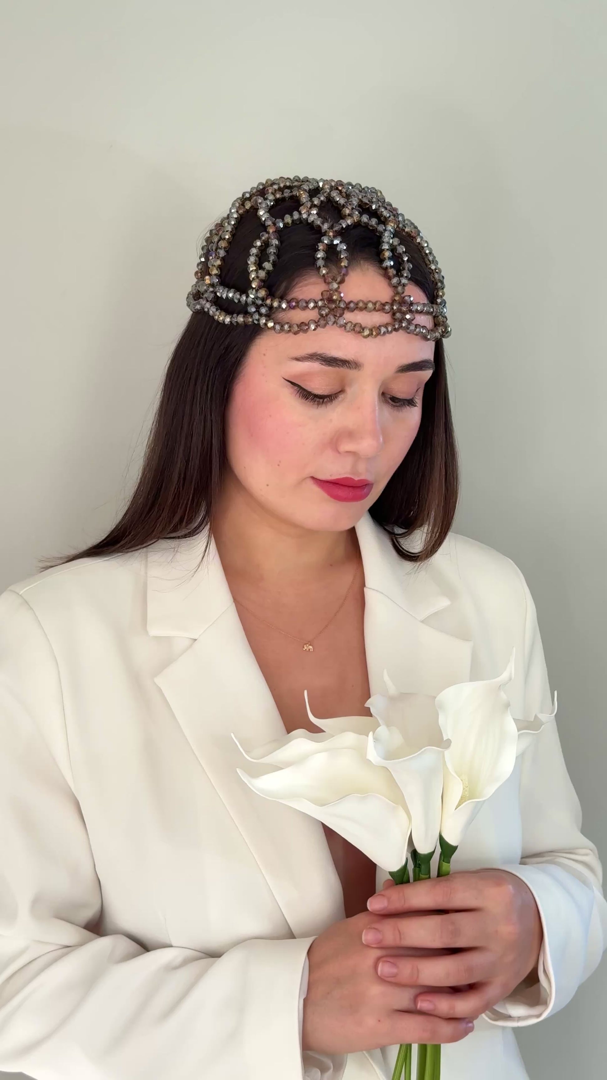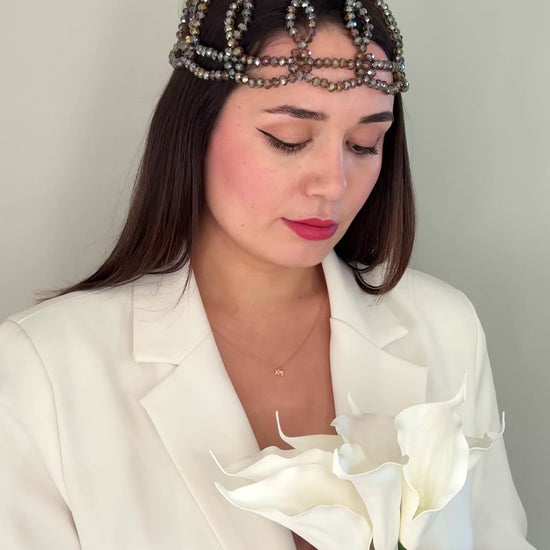 Inspired by Hera, the goddess of women and queenship, this mocha-toned headpiece radiates quiet power and refined beauty. Each crystal bead is meticulously handwoven in Ireland, resulting in a one-of-a-kind design that glows with warmth and sophistication.